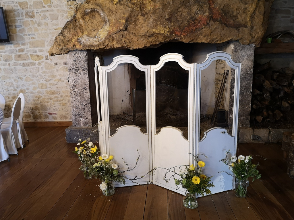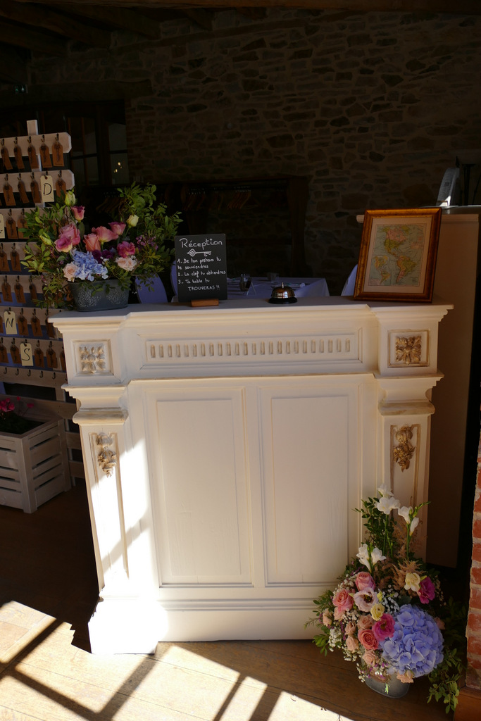 Petit comptoir ( assorti au pupitre ancien) de fabrication artisanale, pour mise en scène accueil des invités, ou décoration de vitrine : RÉSERVÉ Paravent ancien , customisé pour servir de décor de Photo Booth , très belle pièce d'époque