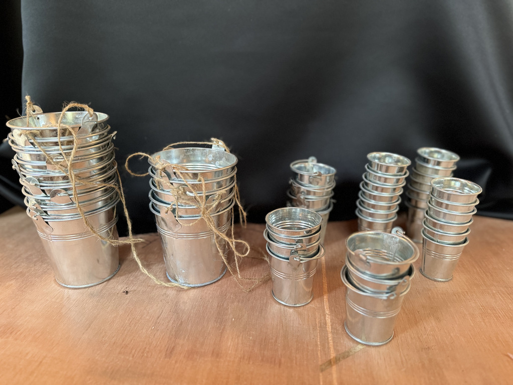 Seaux différentes tailles et couleurs : 43 pièces : 20 petits seaux , hauteur: 6cm, diamètre : 5,5 cm 9 seaux moyens , hauteur : 6,5 cm, diamètre : 6,50 cm 14 seaux moyens /grands , hauteur : 10 cm, diamètre : 10,5 cm 26 pièces : 3 seaux rouges + 5 contenants fleuris( orchidées ) grands + 3 contenants fleuris ( orchidées ) petits + 15 petits seaux fuchsia avec anse .