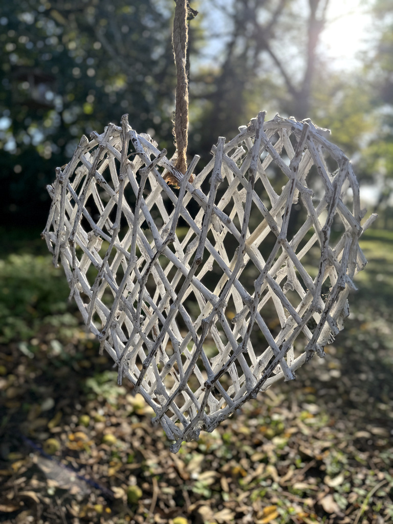 1 grand coeur en rotin gris céruse, à fleurir et à suspendre, idéal pour décoration mariage ou vitrine 5 contenants en rotin blanc, en forme de coeur pour compositions piquées