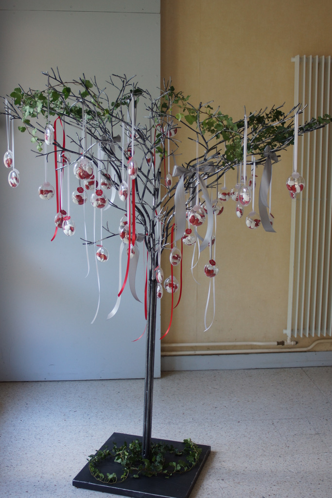 Arbre stylisé noir pouvant servir de support "plan de table", ou support cadeaux d'invités, pouvant s'incorporer dans une vitrine . Prix : 50,00 €