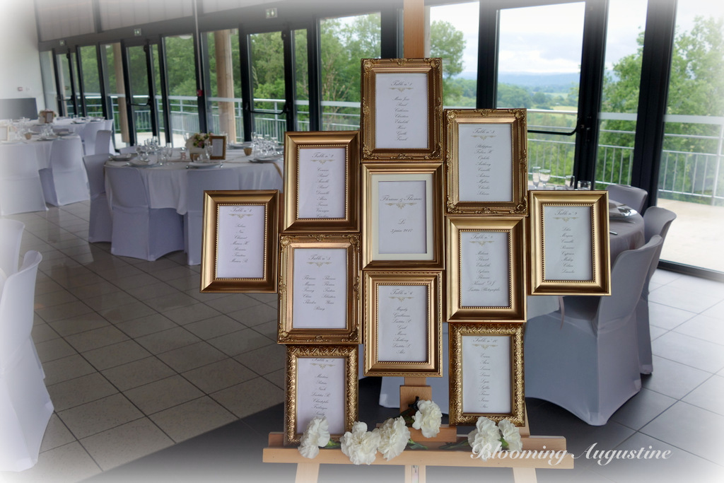 Montage de 10 cadres dorés qui servent de plan de table. Il n'y a plus qu'à insérer ses propres cartes !!! Très original et modèle unique