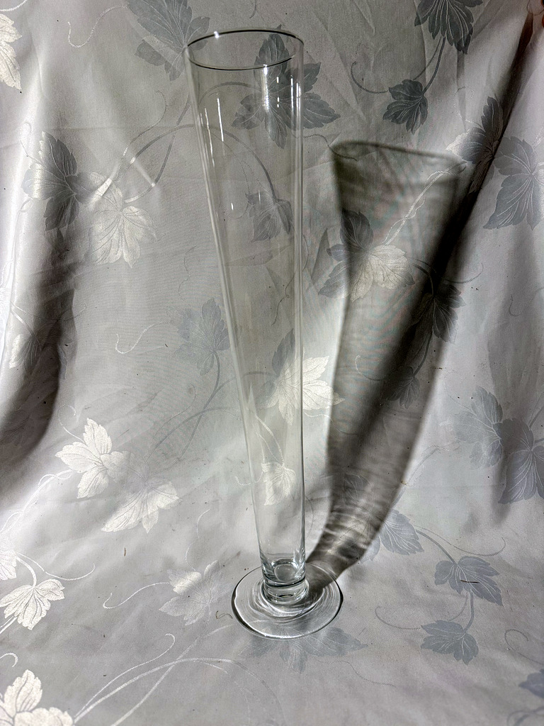 Vases coniques hauts , en verre, hauteur 60 cm, permettant de nombreuses compositions pour centres de table ou décors divers. Très bon état