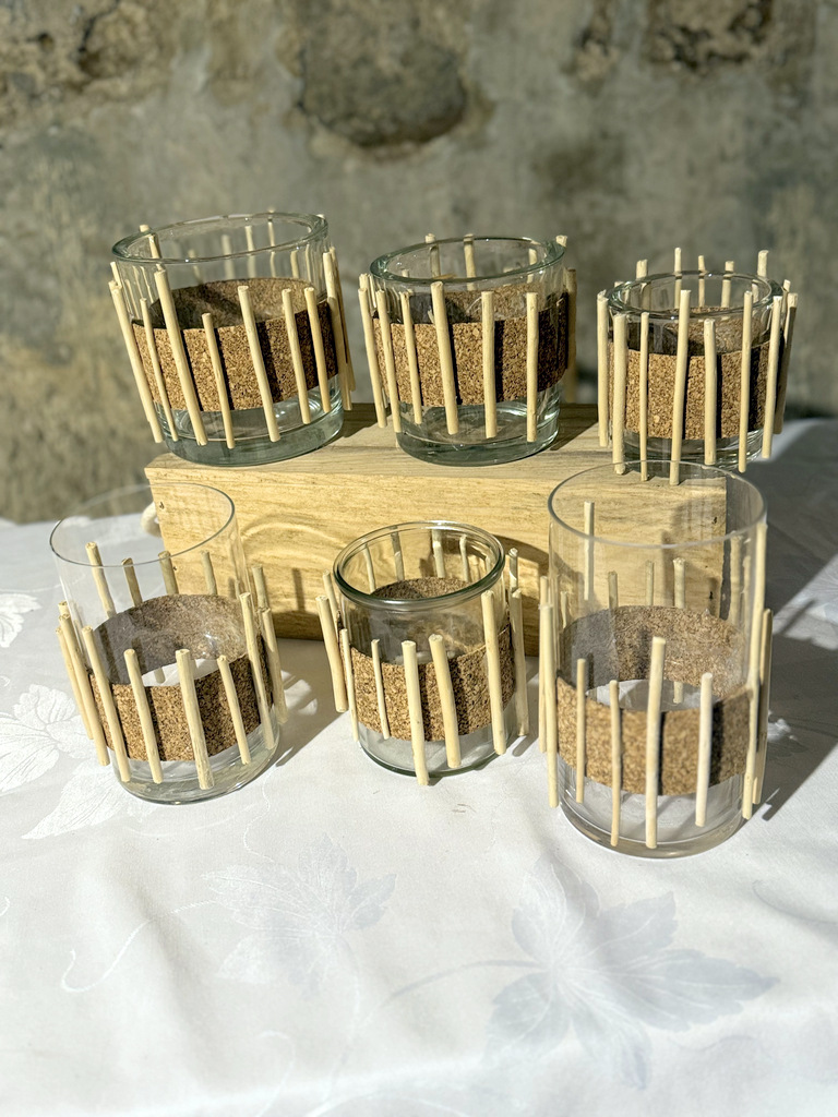 Lot de vases cylindriques , très originaux, contemporains et/ou vintage 9 vases , habillage liège et osier blanc naturel , tailles diverses 4 vases habillage liège et baguettes osier blanc naturel