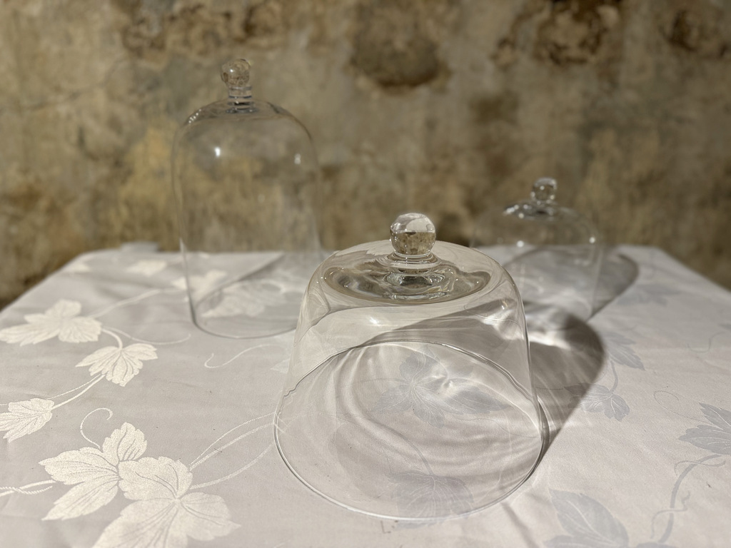 Lot de 2 cloches en verre de tailles différentes 1°) hauteur : 31,5 cm , diamètre : 18 cm : VENDUE 2°) hauteur : 17 cm, diamètre : 16 cm 3°) hauteur : 25 cm, diamètre : 21 cm